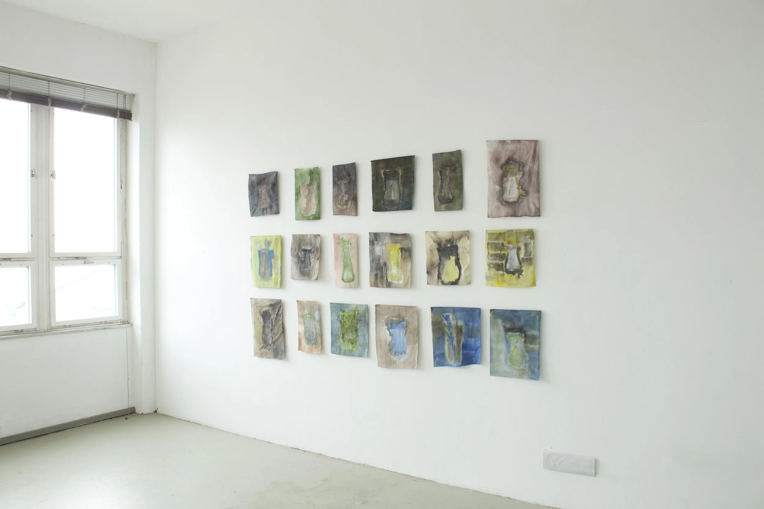 This installation presents a grid of small-scale works on paper or fabric, each capturing vase forms that exist between recognizable vessels and uncontrollable stains. Created with fluid, runny media, the forms are highly malleable and unpredictable, bleeding through the material like veils—translucent layers that both reveal and obscure. The fabrics themselves possess an aged, archaeological quality, as if unearthed from the ground, bearing the patina of time and memory. Each piece records a momentary spilling, an attempt to contain everything within the fabric in a short amount of time before the medium escapes or dries.